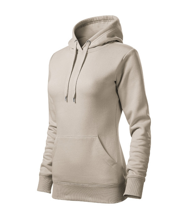 enyhén karcsúsított szabás oldalvarrással, zsinórral összehúzható, bélelt kapucni, hátsó nyakszegély belső oldala saját színű anyagból, rávarrt kenguru zseb, 2:2 bordás kötésű szegély és mandzsetták 5 % elasztánnal, bolyhos belső oldal
